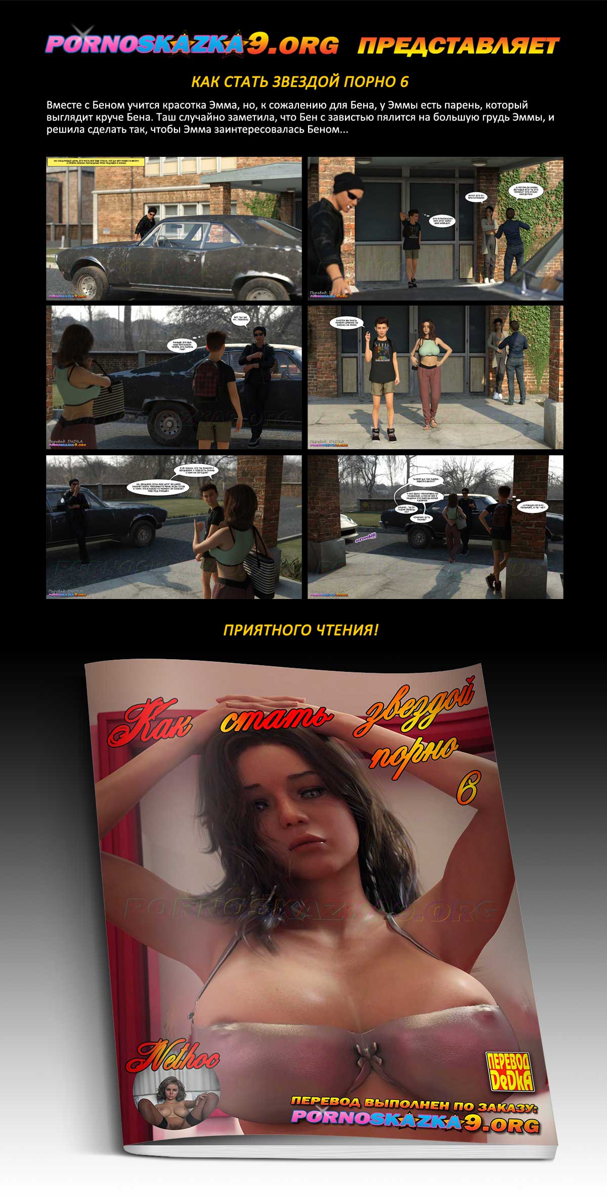 Порно комикс «Как стать звездой порно. Часть 6.» Вместе с Беном учится красотка Эмма, но, к сожалению для Бена, у Эммы есть парень, который выглядит круче Бена. Таш случайно заметила, что Бен с завистью пялится на большую грудь Эммы, и решила сделать так, чтобы Эмма заинтересовалась Беном…